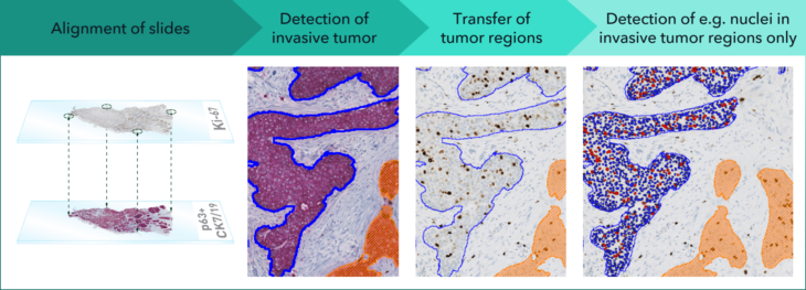 In the workflow illustrated above, serial sections of p63+CK7/19 and Ki-67 are virtually aligned. The p63+CK7/19 slide is evaluated for invasive and non-invasive tumor, which is transferred to the Ki-67 slide. Subsequent biomarker analysis within invasive tumor structures is accurate and according to clinical guidelines.