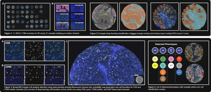 OracleBio: Last year, our collaborative poster with Akoya Biosciences was presented at AACR 2023. OracleBio performed image analysis on samples stained with one of Akoya’s signature mIF panels. We used Visiopharm to profile the immune contexture and tumour spatial interactions in a set of tissue cores, covering a range of NSCLC subtypes and tumour staging. Our approach started with the generation of CD8, CD68 and DAPI cell objects using a Deep Learning algorithm trained on a range of TMA cores. A hierarchical post processing approach was then applied to create CD8, CD68, PanCK and remaining DAPI cell objects for downstream phenotyping. We generated cell object data per core using Visiopharm and carried out spatial analysis using an OracleBio proprietary program (PhenoXplore) to perform neighbourhood analysis for selected phenotypes.