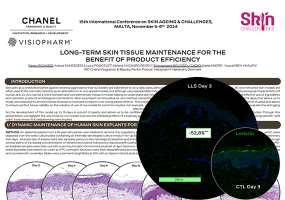 A self-developed model using human skin explants in culture medium, allows our customer CHANEL a flexible way to accurately quantify skin reactions, completely animal-free. Tailored deep learning apps are employed to measure the skin’s response to new developed skin products. In a recent study, the precise measurement of the reduction of Loricrin and other biomarkers over time is used to prove the efficacy of a new skin lotion.