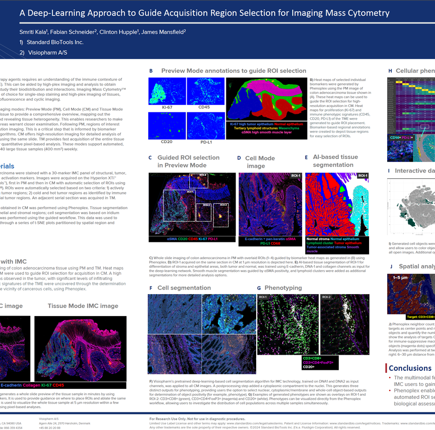 IMC has expanded its capabilities with three distinct imaging modes: Preview, Cell, and Tissue. The Preview Mode is a rapid scanning system that captures a comprehensive overview of the stained tissue, mapping out the distribution of over 40 markers and revealing tissue heterogeneity. This enables researchers to make informed decisions about which areas warrant closer examination on the same. Building on this, Cell Mode offers high-resolution imaging for detailed analysis of the Regions of Interest (ROIs) identified during Preview, all using the same slide. Tissue Mode complements these by providing a fast acquisition of the entire tissue at a lower resolution, which is optimal for quantitative pixel-based analysis of tissue biology. These modes support automated, continuous imaging of more than 40 large tissue samples (400 mm2) weekly. Following Preview Mode, the selection of ROIs for high-resolution imaging is a critical step, enhanced by automated AI algorithms to ensure it is informed by biomarker expression.