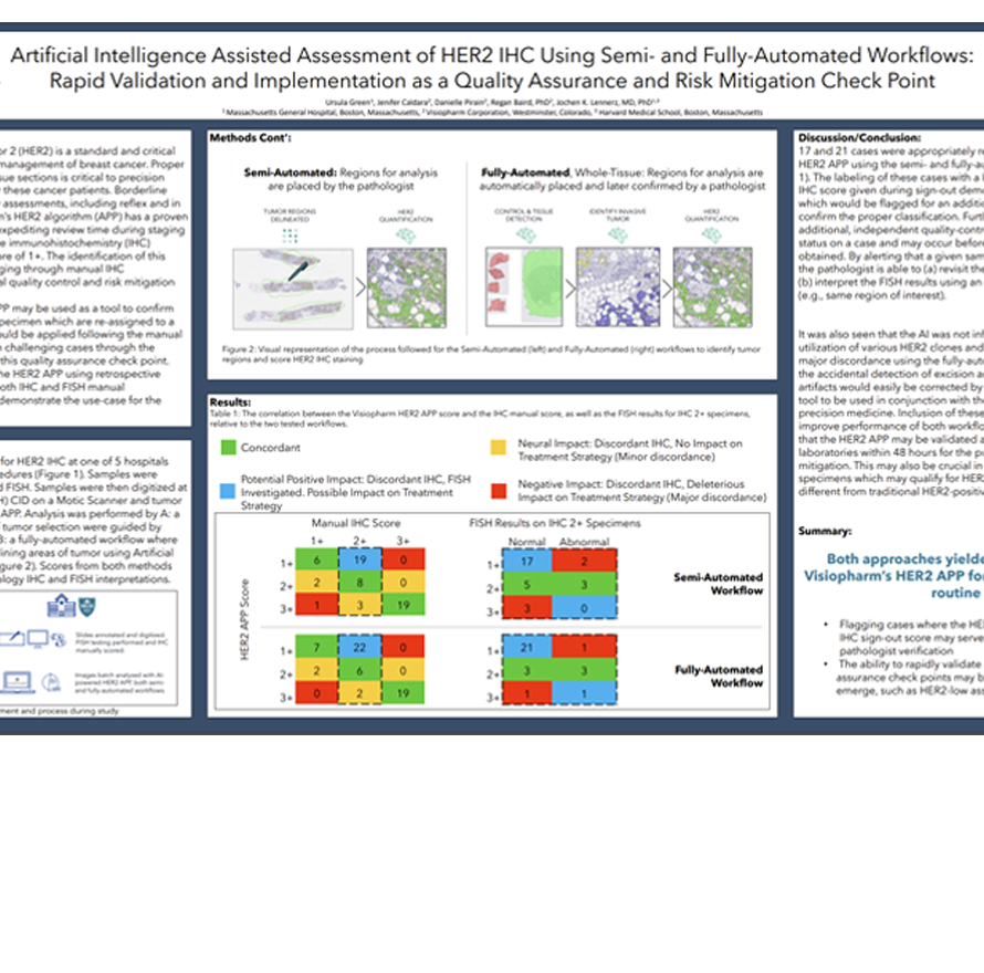 Human Epidermal Growth Factor Receptor 2 (HER2) is a standard and critical biomarker in the staging, diagnosis, and management of breast cancer. Proper classification of HER2 status in stained tissue sections is critical to precision pathology and personalized medicine for these cancer patients. Borderline cases require additional timely and costly assessments, including reflex and in situ hybridization (ISH) testing. Visiopharm’s HER2 algorithm (APP) has a proven track-record of assisting pathologists by expediting review time during staging and identifying borderline cases which are immunohistochemistry (IHC) positive, ISH normal as having a HER2 score of 1+. The identification of this population has been traditionally challenging through manual IHC interpretation, and AI can provide a crucial quality control and risk mitigation