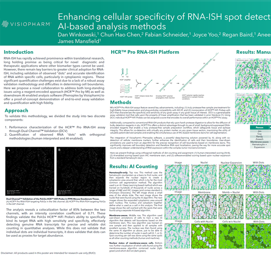 RNA-ISH has rapidly achieved prominence within translational research, long holding promise as being critical for novel diagnostic and therapeutic applications where other biomarker types cannot be used. However, there remain key barriers to greater clinical adoption for RNAISH, including validation of observed ”dots” and accurate identification of RNA within specific cells, particularly in cytoplasmic regions. These significant quantification challenges exist due to a lack of a robust assay validation methodology and difficulties in determining cell boundaries. Here we propose a novel collaboration to address both long-standing issues using a reagent-encoded approach (HCR™ Pro by MI) as well as downstream AI-enabled analysis software (Phenoplex by Visiopharm) to offer a proof-of-concept demonstration of end-to-end assay validation and quantification with high fidelity.