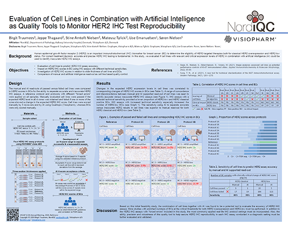 Human epidermal growth factor receptor 2 (HER 2) is an important immunohistochemical (IHC) biomarker for breast cancer (BC) to determine the eligibility of HER 2 targeted therapies both for classical HER 2 overexpression and HER 2 low status For correct treatment decision, accurate and precise HER 2 IHC testing is fundamental. In this study, we evaluated if cell lines with relevant and critical expression levels of HER 2 in combination with artificial intelligence (AI) could be used to identify inaccurate HER 2 IHC assays.