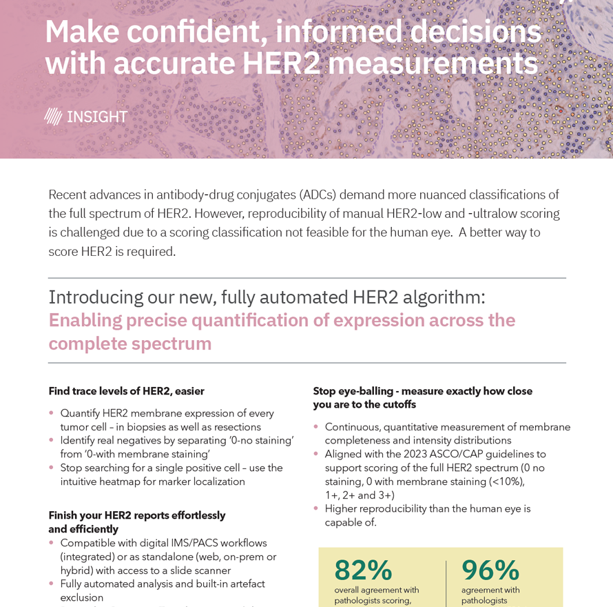 Recent advances in antibody-drug conjugates (ADCs) demand more nuanced classifications of the full spectrum of HER2. However, reproducibility of manual HER2-low and -ultralow scoring is challenged due to a scoring classification not feasible for the human eye. A better way to score HER2 is required.