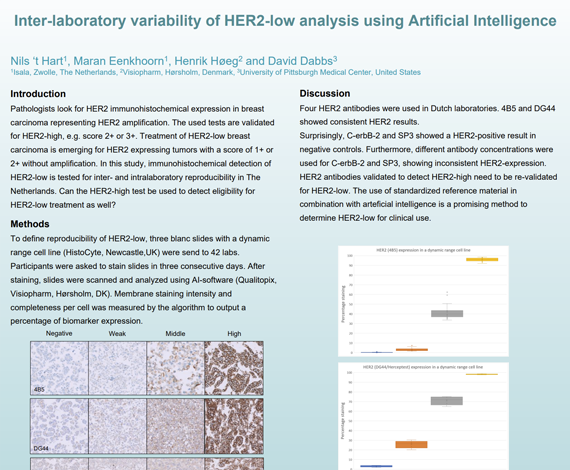 Pathologists look for HER2 immunohistochemical expression in breast carcinoma representing HER2 amplification. The used tests are validated for HER2-high, e.g. score 2+ or 3+. Treatment of HER2-low breast carcinoma is emerging for HER2 expressing tumors with a score of 1+ or 2+ without amplification. In this study, immunohistochemical detection of HER2-low is tested for inter- and intralaboratory reproducibility in The Netherlands. Can the HER2-high test be used to detect eligibility for HER2-low treatment as well?