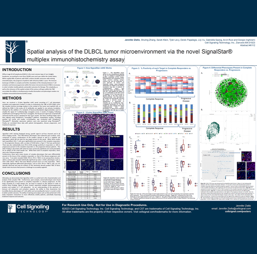 Diffuse Large B-Cell Lymphoma (DLBCL) is the most common type of non-Hodgkin lymphoma, accounting for more than 18,000 cases each year within the United States. While roughly 60% of patients with DLBCL achieve durable remissions with existing chemotherapies, the prognosis of patients with refractory DLBCL is poor. The immune landscape of DLBCL is complex and further elucidation of the interplay between T cell activation and immunosuppression within the tumor microenvironment (TME) is necessary in order to better stratify patients and predict outcomes for therapy. This complexity, as well as the relevance of the spatial context of the various cell types within the TME necessitate the ability to simultaneously visualize biomarkers and phenotypic markers via multiplex immunohistochemical (mIHC) assays.